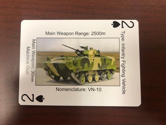 美国陆军训练及战略思想司令部(United States Army Training and Doctrine Command,TRADOC)表示,已印制“中国武器扑克牌”给士兵,上面印有中国的战斗车辆、武器装备的外观及其性能,助他们在啤牌游戏中识别相关军备。消息指俄罗斯和伊朗武器装备版本也在制作中,将会在今年稍后时间推出。