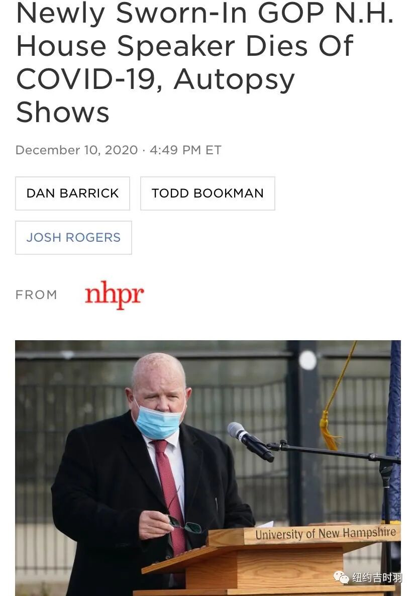 12月10日,71岁的新罕布什尔州众议院议长Dick Hinch也因新冠肺炎去世。他刚刚带领州共和党人在选举中击败了民主党人,获得了参众两院控制权。