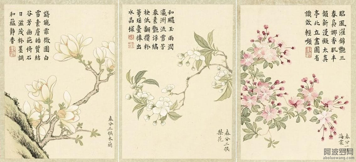 清 董诰《二十四番花信风图 册》局部,春分三候:海棠,梨花,木兰。(台北故宫博物院,明慧之窗合成)