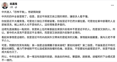 吴嘉隆日前在他的脸书发文说,中共的四中全会是开了,但是,习近平张又侠之间的博弈,让很多人看不懂。“你说习近平大权旁落,可是他三个位子照样留着,你说习近平仍然大权在握,可是他在军中部署的人全部被清洗,补上来的人也不是他的人,这些现象是矛盾的”。