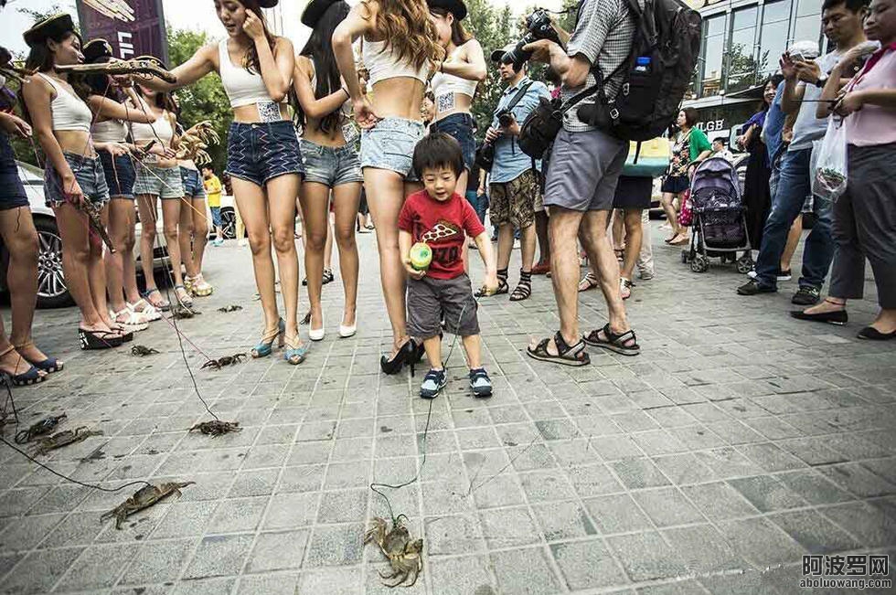 7月22日北京三里屯出现奇葩一幕:大群身着短裤露脐背心,头戴蓓蕾帽,脚蹬超高跟鞋美女在街头溜螃蟹。天气闷热,美女身材火辣,兴致十足,只是苦了一只只被细线牵着溜的螃蟹。惹得行人驻足拍照观望,有小童也凑热闹。